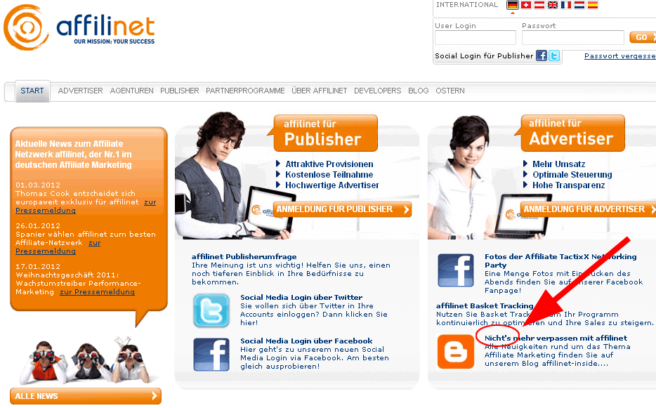 Beim einem der größten deutschen Affiliate-Netzwerke affilinet gibt es momentan einen Hinweis auf der Startseite, dass man “mit affilinet nicht’s mehr verpasst”.