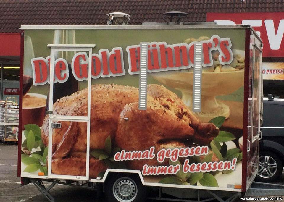 Die Gold Hühner’s – nur echt mit Deppenapostroph und Deppenleerzeichen. Unser Vorschlag für einen alternativen Werbeslogan: „Einmal gelesen, nie dort gegessen.“