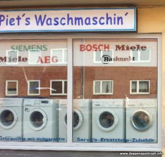 Bei “Waschmaschin’ ” handelt es sich um die niederdeutsche Form von Waschmaschine mit der typischen e-Apokope. Diese durch ein Apostroph anzuzeigen ist eigentlich nicht nötig. Der Firmenname ist also komplett.