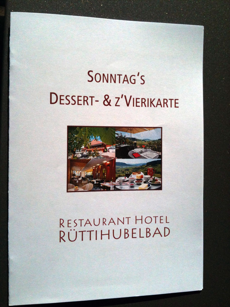 Sonntag’skarteVeröffentlicht am 26. Oktober 2012von AndreasGastronomie im Restaurant Hotel Rüttihubelbad Fundort auf der Karte anzeigen Teilen Twittern