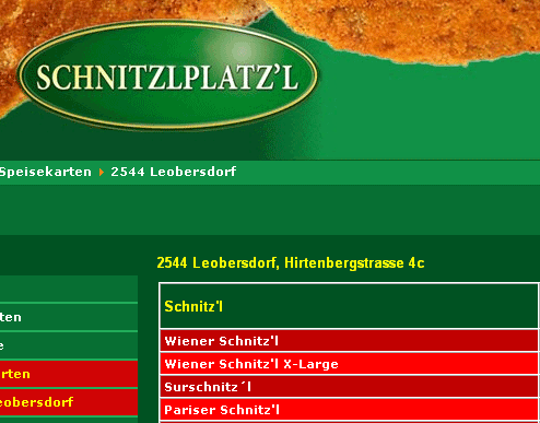 Das in Österreich beheimatete Restaurant Schnitzlplatz’l ist eine wahre Fundgrube für Deppenapostroph-Freunde. Nicht nur im Restaurantnamen haben sich unnötige Apostrophe eingenistet, auch auf der Speisekarte werden sie inflationär gebraucht, denn dort gibt es u.a. “Wiener Schnitz’l” oder “Schnitz’lsemmel“. Auch “Süsses” gibt es dort zum Dessert, wobei hier eher ein ß angebracht wäre.
