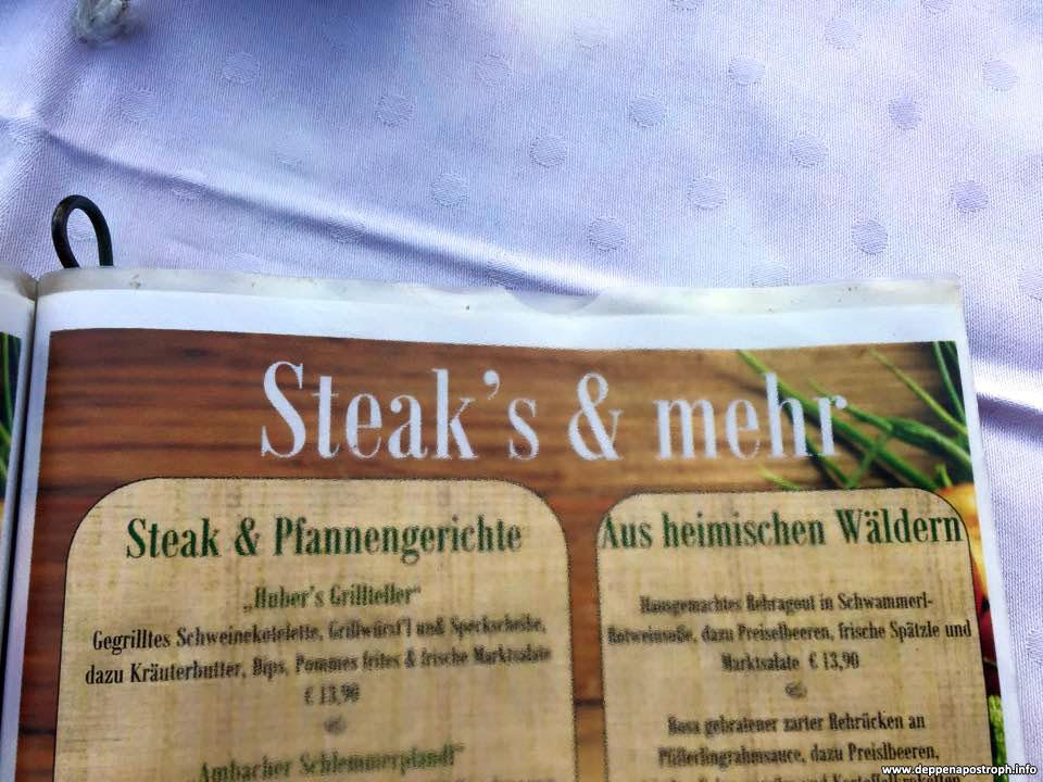 Fundort auf der Karte anzeigenEin Deppenapostroph jagt den nächsten auf der Speisekarte des Landhotels Huber in Ambach am Starnberger See.