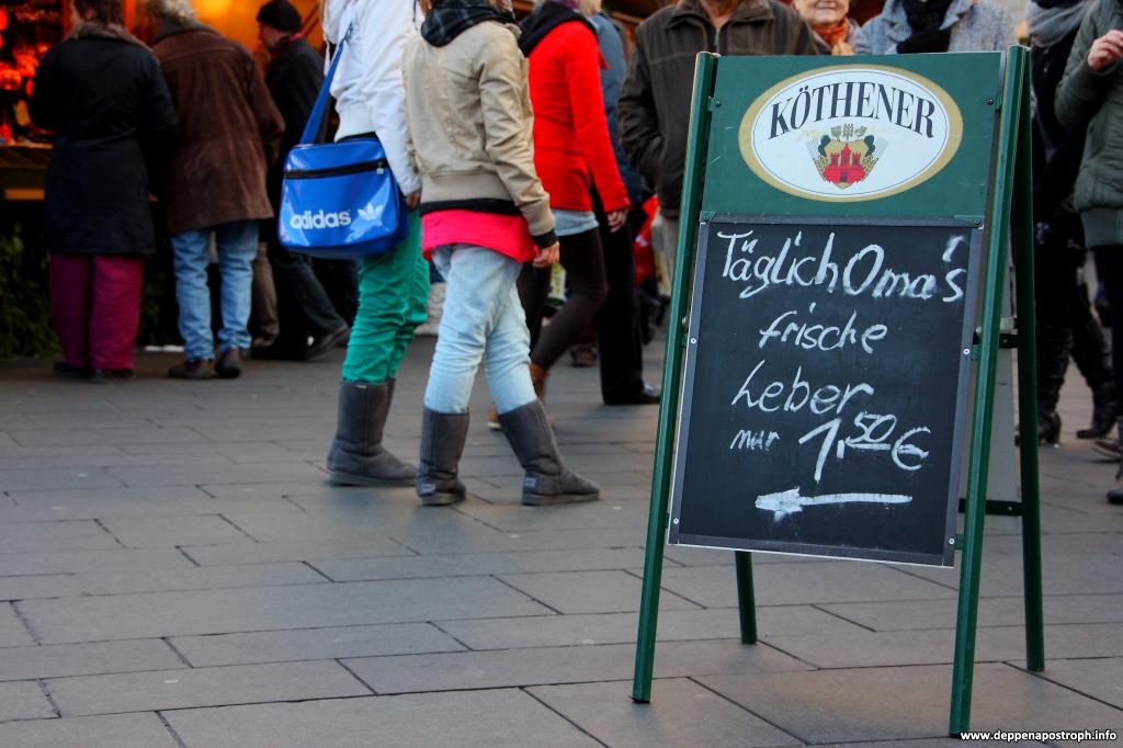 Auf dem Weihnachtsmarkt in Halle gibt es für nur 1,50€ täglich “Oma’s frische Leber“. Egal ob hier nun Organhandel oder nur Omas gute Küche im Spiel ist: auf jeden Fall ist der Deppenapostroph auf diesem Schild falsch.