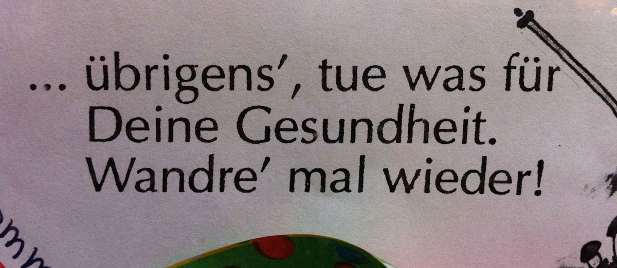 Übrigens': wandre’ mal wieder!Veröffentlicht am 20. März 2012von AndreasSchilder Das wandre’n ist des Müller’s Lust? Wer auf diesem Schild Deppenapostrophe findet, darf sie behalten. Teilen Twittern
